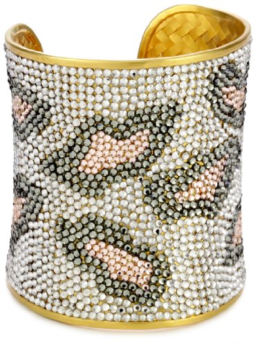 This cuff bracelet features 24k gold vermeil over sterling silver with leopard print ,light peach, crystal silver shade and black diamond Swarovski crystals pave.Made in USA.Handmade in Los Angeles.Weights and sizes are approximate in that each piece is handmade and varies accordingly..