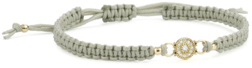 Mizuki's dainty eye disc with glistening rose cut and full cut diamonds, sits in the center of a macramé bracelet made of sage colored polysilk There are two faceted gold beads on each side of the charm that sparkle like diamonds.Evil eye charm with rose cut center surrounded by white full cut diamonds .10CT.Made in USA.Adjustable sage polysilk macramé with four 14K faceted gold beads, two surrounding the charm and two by the closure.Total weight of bracelet is 2 grams...